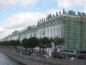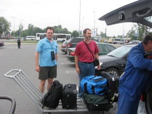The flight from Munich to St. P was only 2 ½ hours, and at 4 pm we landed in St. P. Lydia and I had a window this time and marveled at the expanse of the Bay of Finland as we approached the airport. After we passed through passport control in St. P, our luggage was practically waiting for us in one big pile! All 13 pieces arrived with only minimal damage to a few of the suitcases. Another surprise was our team leader, Bill O’Byrne, who met us with a cart for the luggage. He surreptitiously skirted the customs officials to meet us.