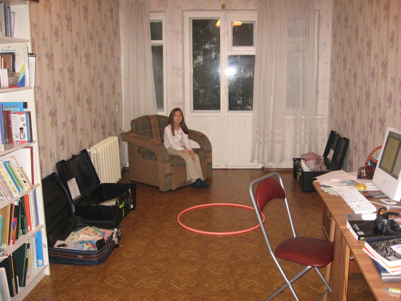 The room here is becoming a multi-purpose room, probably mainly for our office and schooling (although until we get another table, the kitchen will do). Lydia also likes it to practice her hoola hoop.
