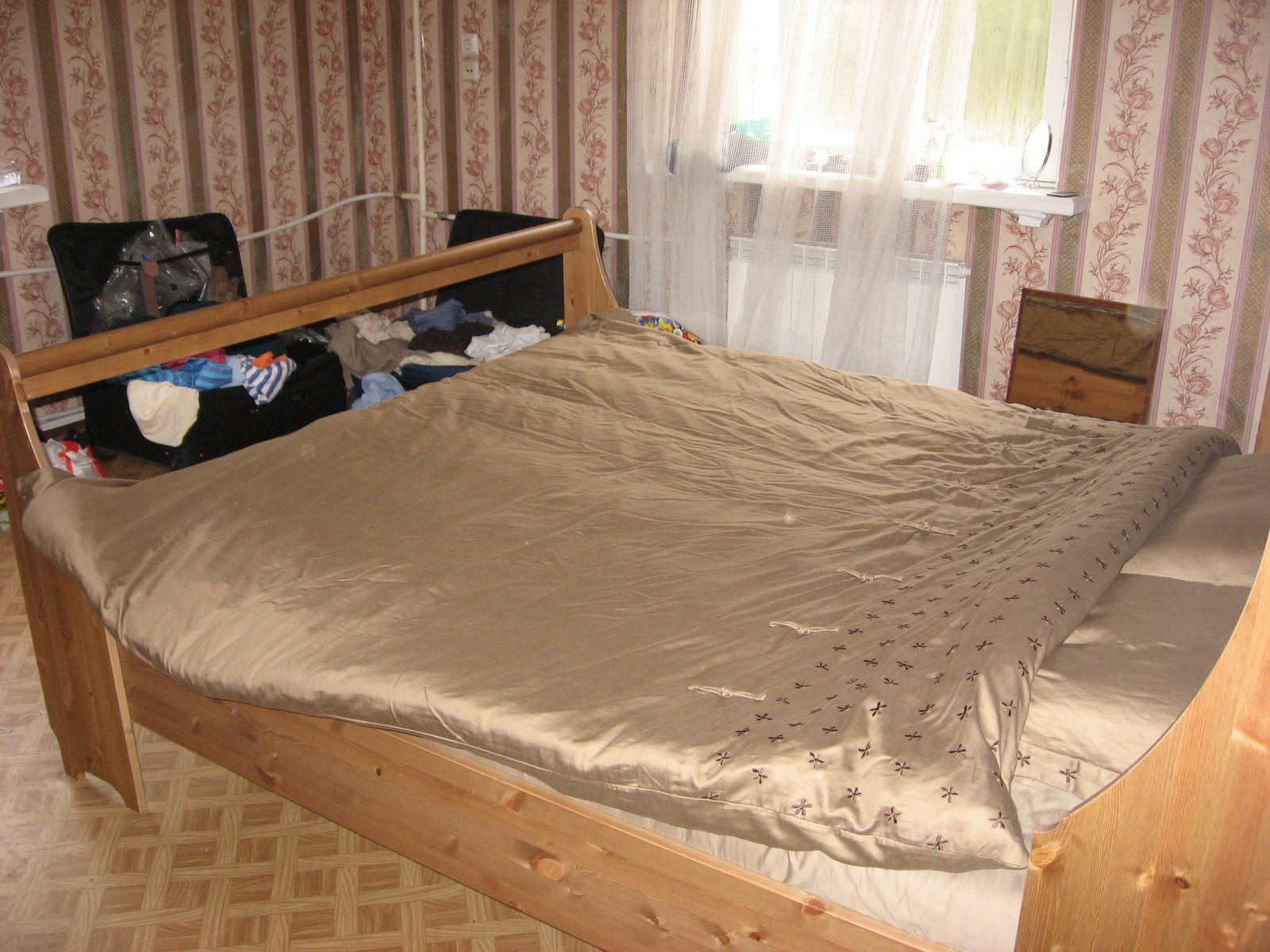We are very happy with our new bed, but you can see we still live out of suitcases. Take a closer look at the wallpaper there.