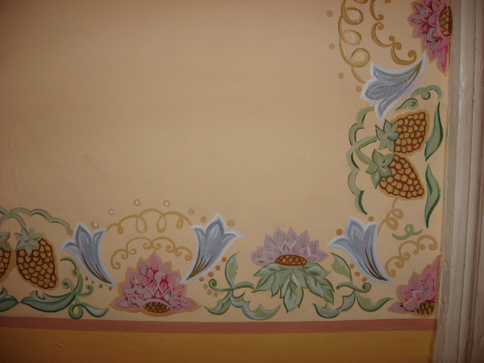 The bath is a good example of the owner’s paint work. The background is wallpaper, and the larger flowers are hers.