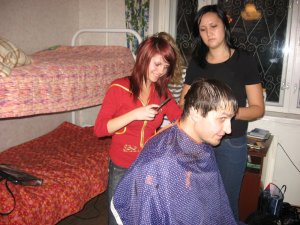 Here you see Andy (the video guy) getting a haircut from one of the residents during her first haircutting class.