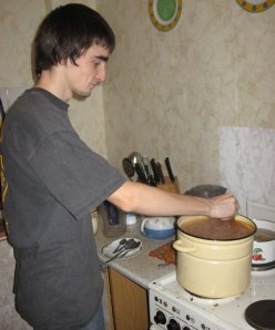 So I began with a group of four kids – three boys and a girl – on the 19th. We have a good time together. The first week we got to know each other, and last week we stayed in the kitched after dinner (we all eat together before class) and and discussed action verbs like eating and drinking. Of course no one is telling me their life story yet, but we are getting more comfortable with each other. One kid has already been hinting at his desire to come visit us at home (Yuri, pictured cooking).