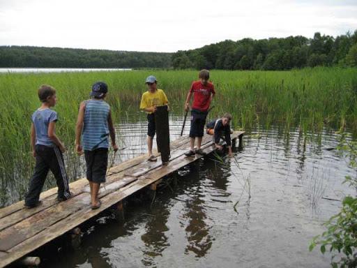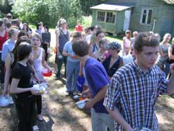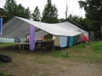 surpassed our hopes. In addition to a few Christian families that are living there all summer, in July we hosted two camps run by a local church. First was a children’s camp with 80 participants and then a youth camp with 100 participants. Since we don’t have much decent housing, the campers stayed in tents. Even the kitchen was under a tent, and the picture at left is of the ‘dining hall’. The church did a great job of improving the land — clearing the swimming area, building outhouses, clearing trash, they even built a dock in the lake. A pleasant surprise is that some neighbors are quite enthusiastic about having the camps there. Several attended meetings when the children sang or presented programs, and now they have started bringing us fresh milk, eggs, and v