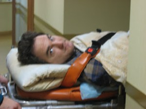 Now the team of 2, a man and woman, take their time trying to figure out how to transfer me to the ambulance while shivering from the cold is making my back tense up and send excruciating pain all around. They finally decided that drugs were their best bet, which cost me 5 more minutes while they waited for them to kick in. It was still torture to move me, which took them (the driver of course didn’t care to help) as well as Igor and Angela and Diana. I protested that the drugs weren’t working. The medic said the proof that they were was in the fact that I made it.