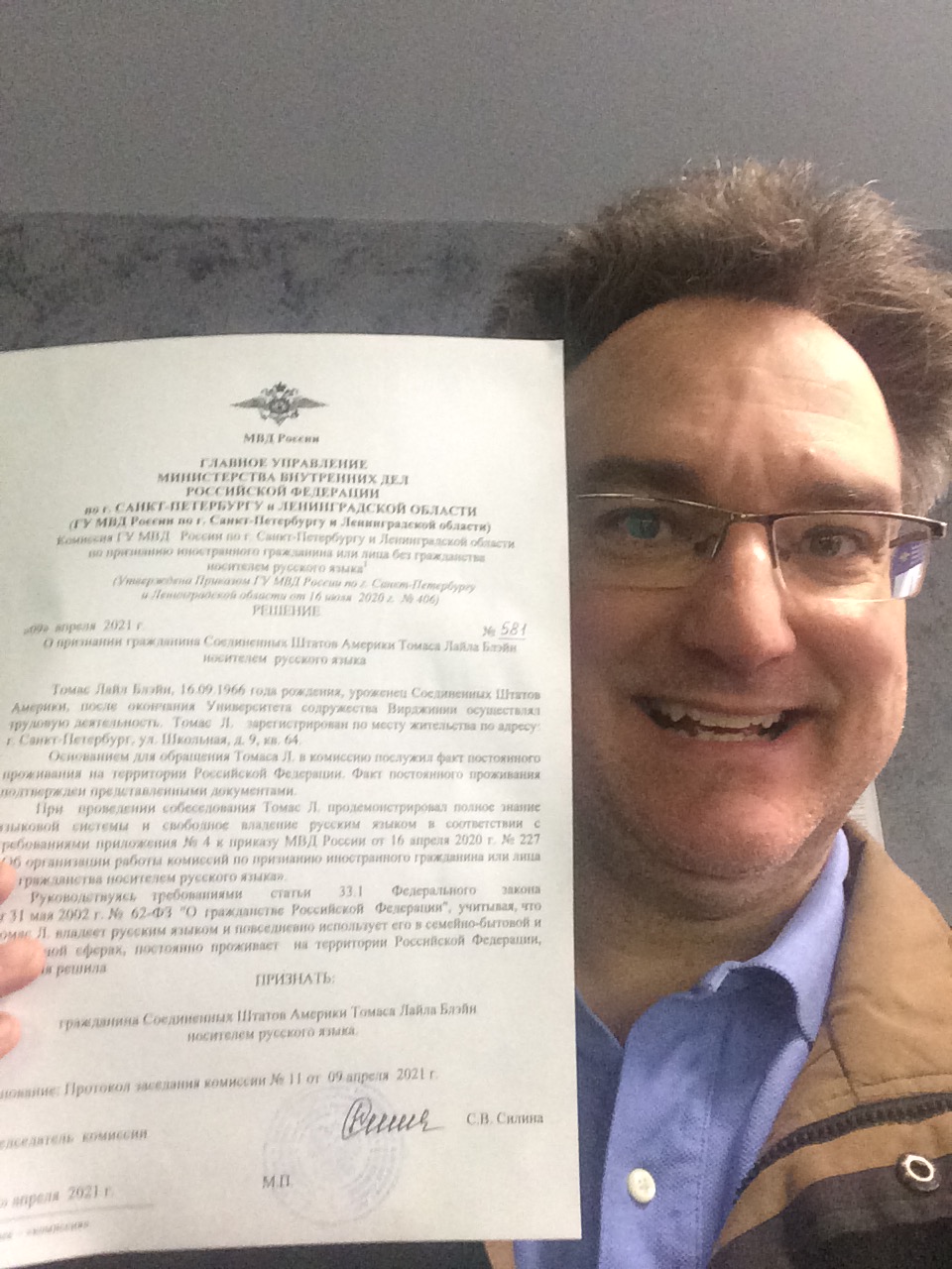 On the recognition of citizen of the United States of America Lyle Blaine Thomas as a native Russian speaker