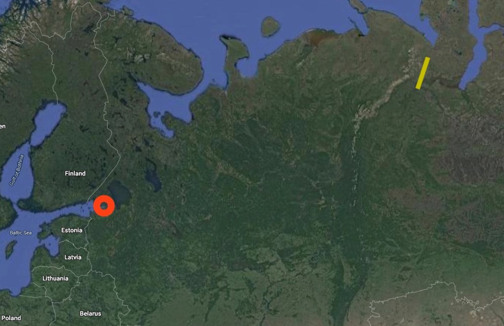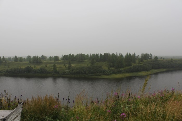 The Siberia I had known was the land of Taiga – coniferous evergreen forests of subarctic land, picking up just to the south of where the tundra leaves off. As was explained to me by a reindeer herder we lived with, the Taiga starts just south of the Ob River, which we had crossed at the capital city of Salekhard. They have the deer pasture in the Taiga during the winter, and they move up north to the Kara Sea for the summer. The start of the tundra, coincides here with the start of the Arctic Circle. Our destination was an interesting little (in Siberian terms) corner of land just inside the Arctic Circle and just to the right of the Ural mountains. Siberia is, after all, all of Russia east of the Urals, which go pretty much the entire north-south distance, fading out at the other end at the border with Kazakhstan. In fact, at our northern-most point in our journey, we could see the Ural mountain range fading into nothingness just before the Kara Sea beyond. How far north were we? Notice from the map I made that St. Petersburg is on the 60th parallel, pretty much where Anchorage is. We were close to the 68th parallel.