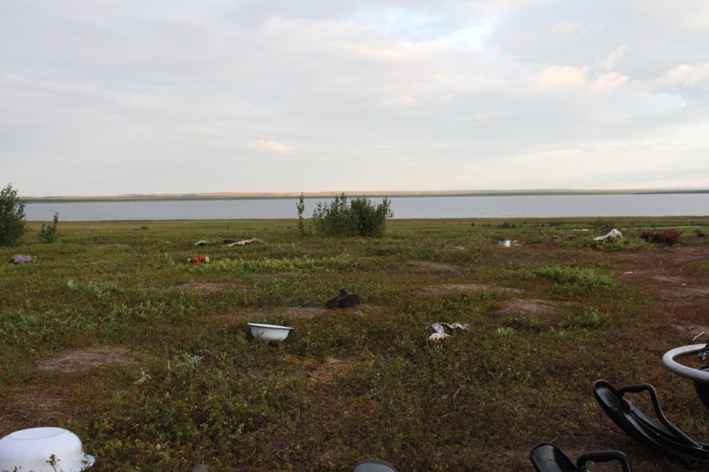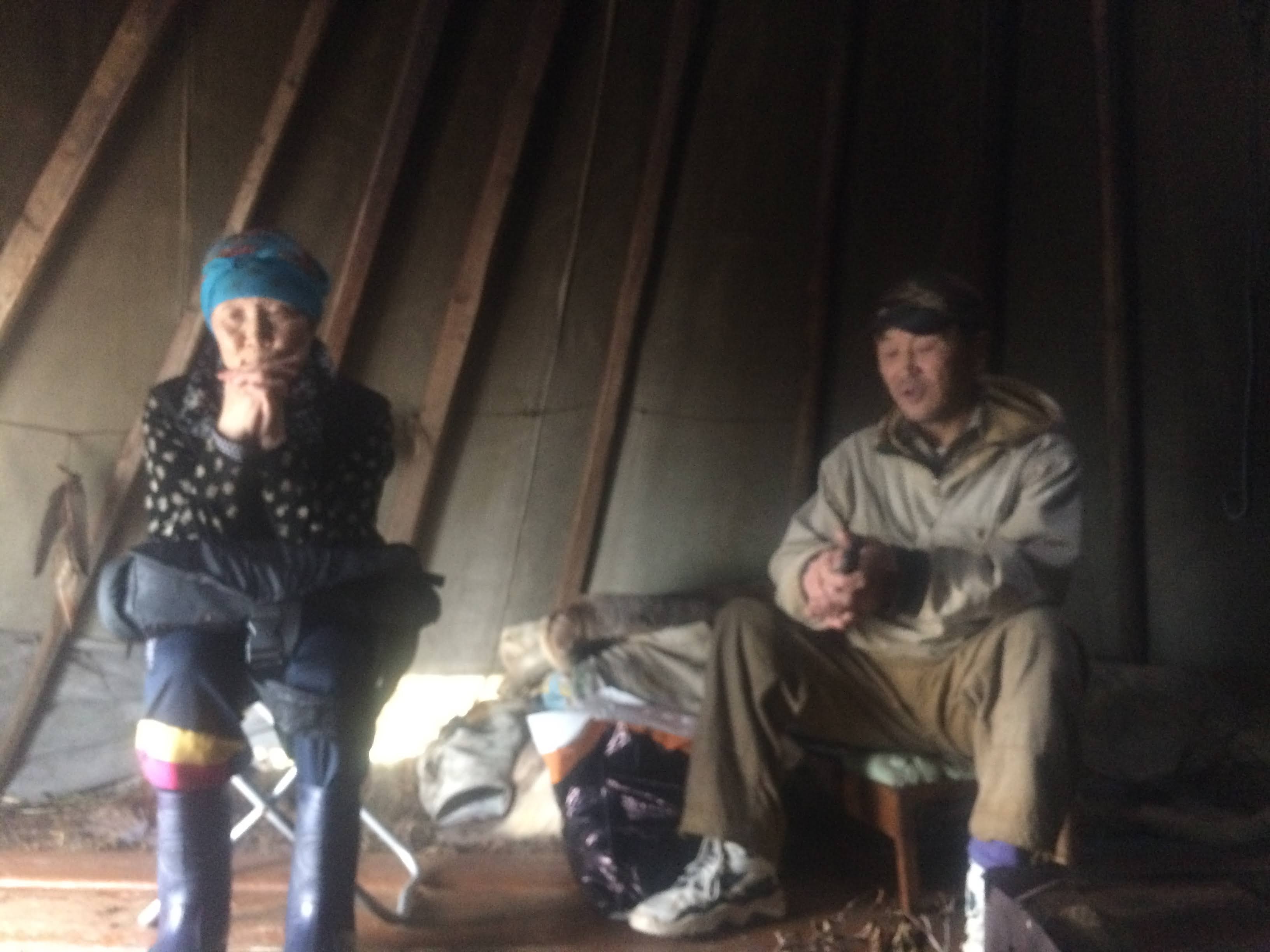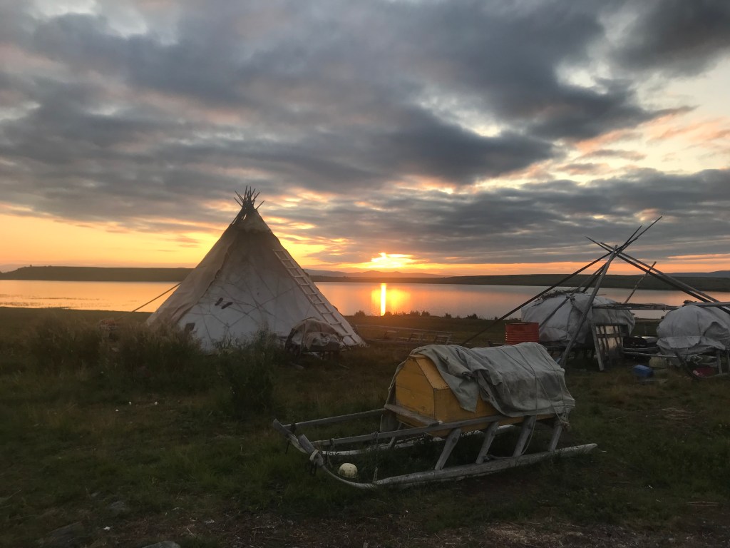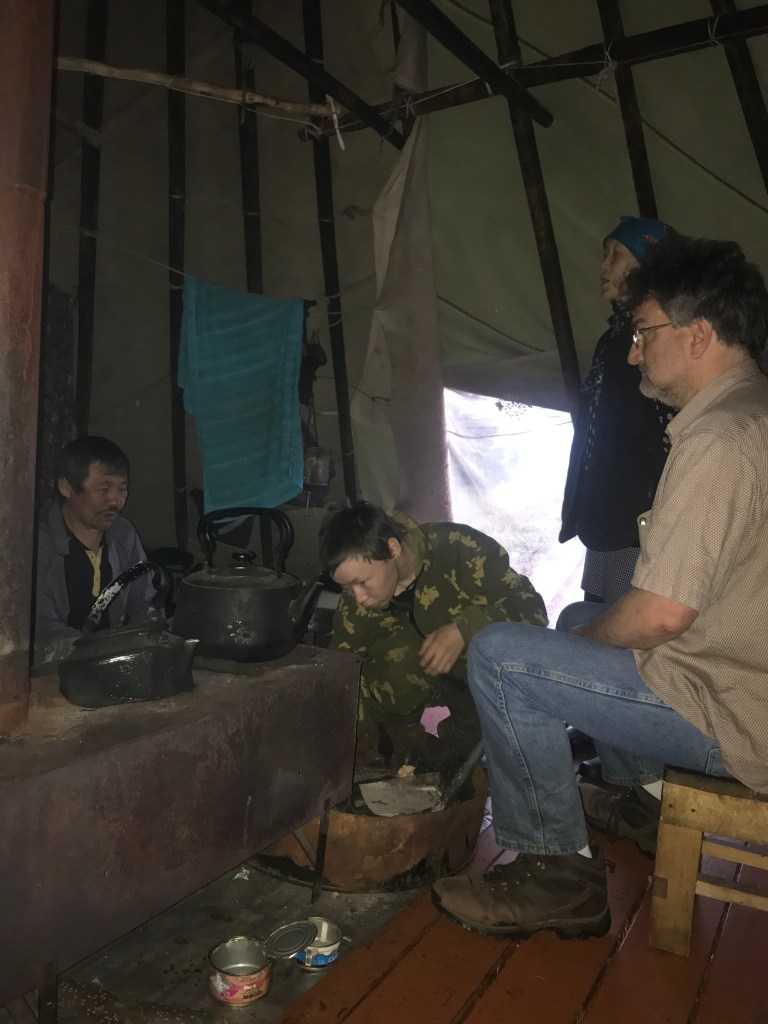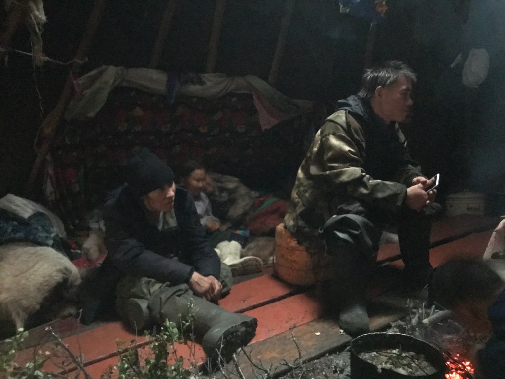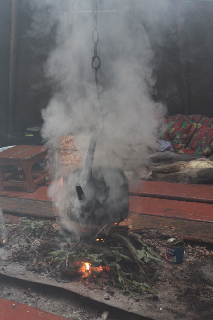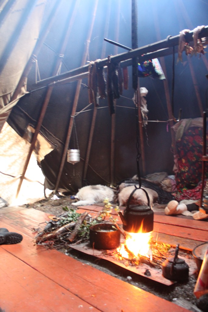 Although there was no formal greeting, our hosts invited us in, where we could finally rest after such a grueling day along the side of the chum, where there are pillows and reindeer skin on the floor. The floor is made of individual planks (they were always orange wherever we went for some reason) except for open ground near the entrance for firewood and brush, and of course under the fire itself. Above the fire hang the fish for drying. The kids were sweet, but they didn’t open up until the next day. They mostly sat on the kids’ side of the chum until much later when they started to warm up to us.