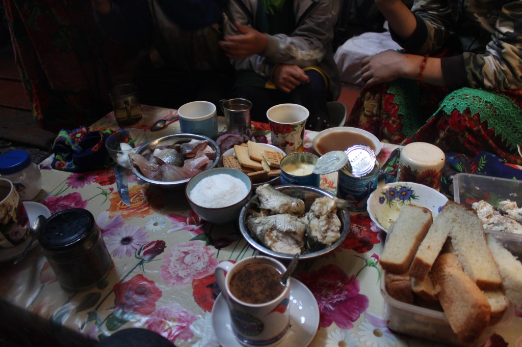 The meal was fish in two forms: boiled and raw. Kerith was the only one of the three of us with the constitution and character to give the raw fish a go, but he really liked it. They dip it into oil. I thought the plain boiled was just fine, so that was enough for me. The white stuff is just sugar for tea. The cookies behind it are like our animal crackers. The orange stuff is cloudberries with just a bit of sugar. I had never had them (barely even heard of it in English), and I was not crazy about the flavor, but Kerith fell in love with them. They grow up in these parts, and picking them is one way locals can earn money.