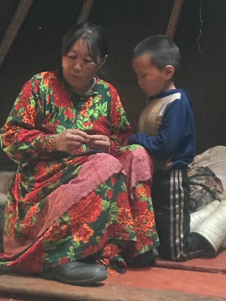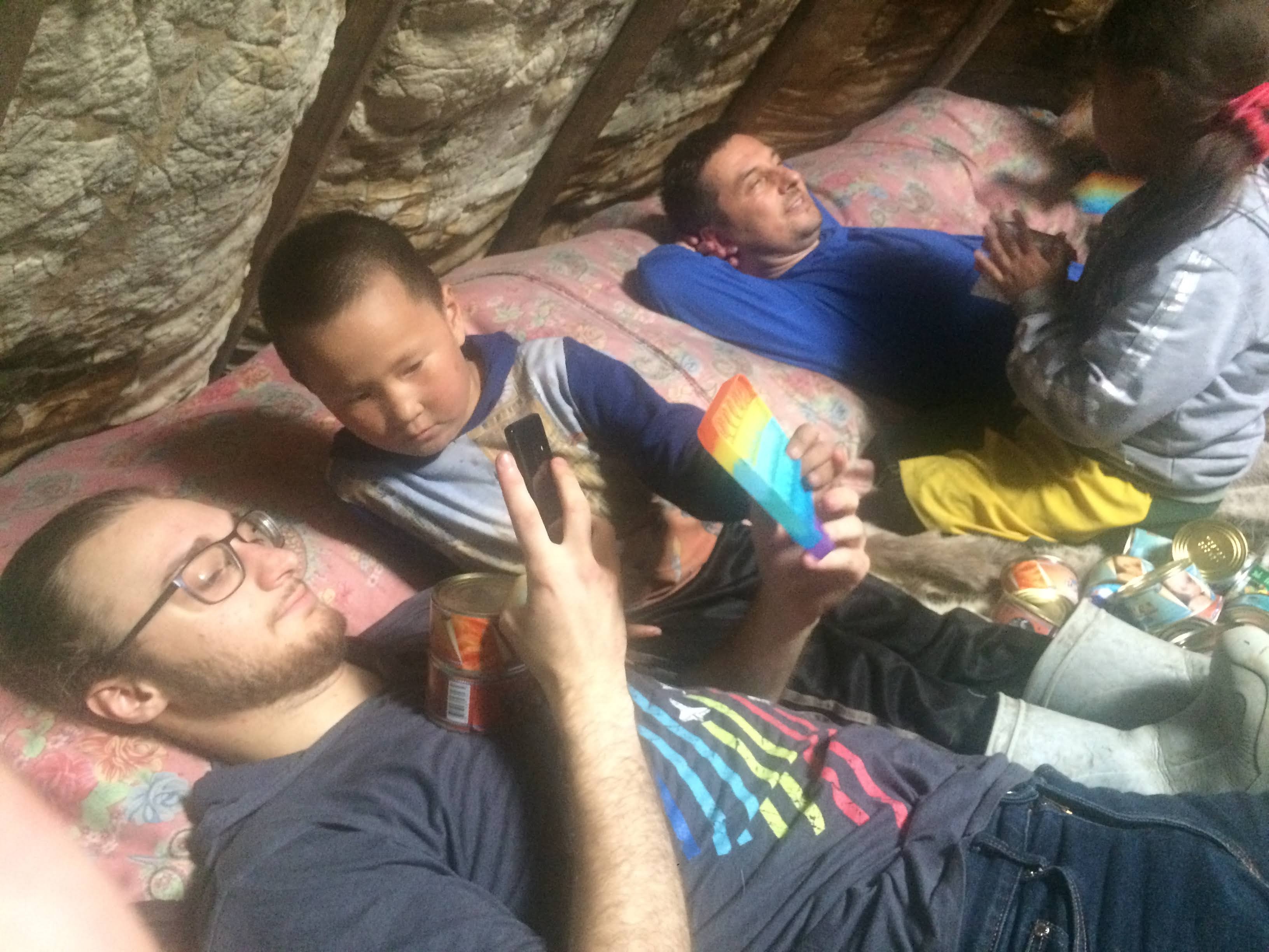 Bedtime was a curious experience. The area we were lounging in became the bedrooms thus: It got dark early because the tent is so dark and because it was cloudy outside, and they hung sheets on the walls which then drop down like partition sheets to separate one “room” from the next. The effect is to provide a measure of privacy (and relief from the mosquitoes, since they did not keep the fire going overnight). Of course this privacy is minimal. All the chums we were in had a diameter of about 6 meters. The family was comprised of three adults and four children, and there were four of us. The south quadrant was entrance-related. The north side was food and stuff-related. So the kids and Nina’s son slept on the west side. The rest of us were on the opposite side, jammed next to each other like kids at summer camp. What I didn’t realize was that this was not yet bedtime. While I was trying to go to sleep, everyone else was talking away. Hey, with no lights, and no TV, what better to do than talk? Igor spent what seemed like hours with the kids (before they actually went to bed on the other side) snuggled up next to him looking at all the pictures on his phone, listening patiently to a story for each and every one. He had photos going back so far that he even surprised himself when he found one of his daughter with my boys when they were all little kids at school. Then someone else came home, and it was tea time. Igor sang songs with motions for the kids. They watched with interest, but they didn’t much care to join in. Then it was finally bed time for real.